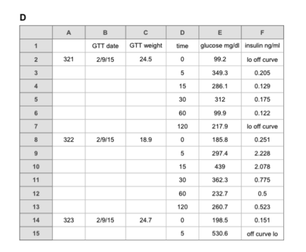 Instead, we have time series measurements spread across multiple rows, mixed data types in the insulin column (numbers and "lo off curve"), and repeated subject information hidden through empty cells. This means even simple operations like calculating mean glucose levels by time point or plotting glucose curves require data reshaping and careful handling of missing/special values.